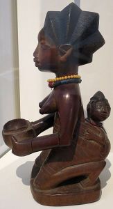 Kneeling Yoruba worshiper with child; photo by Hiart (Own work) [CC0], via Wikimedia Commons